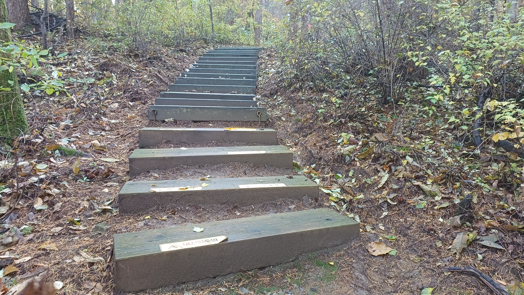 나무 사이로 내려가는 산사면길이다.