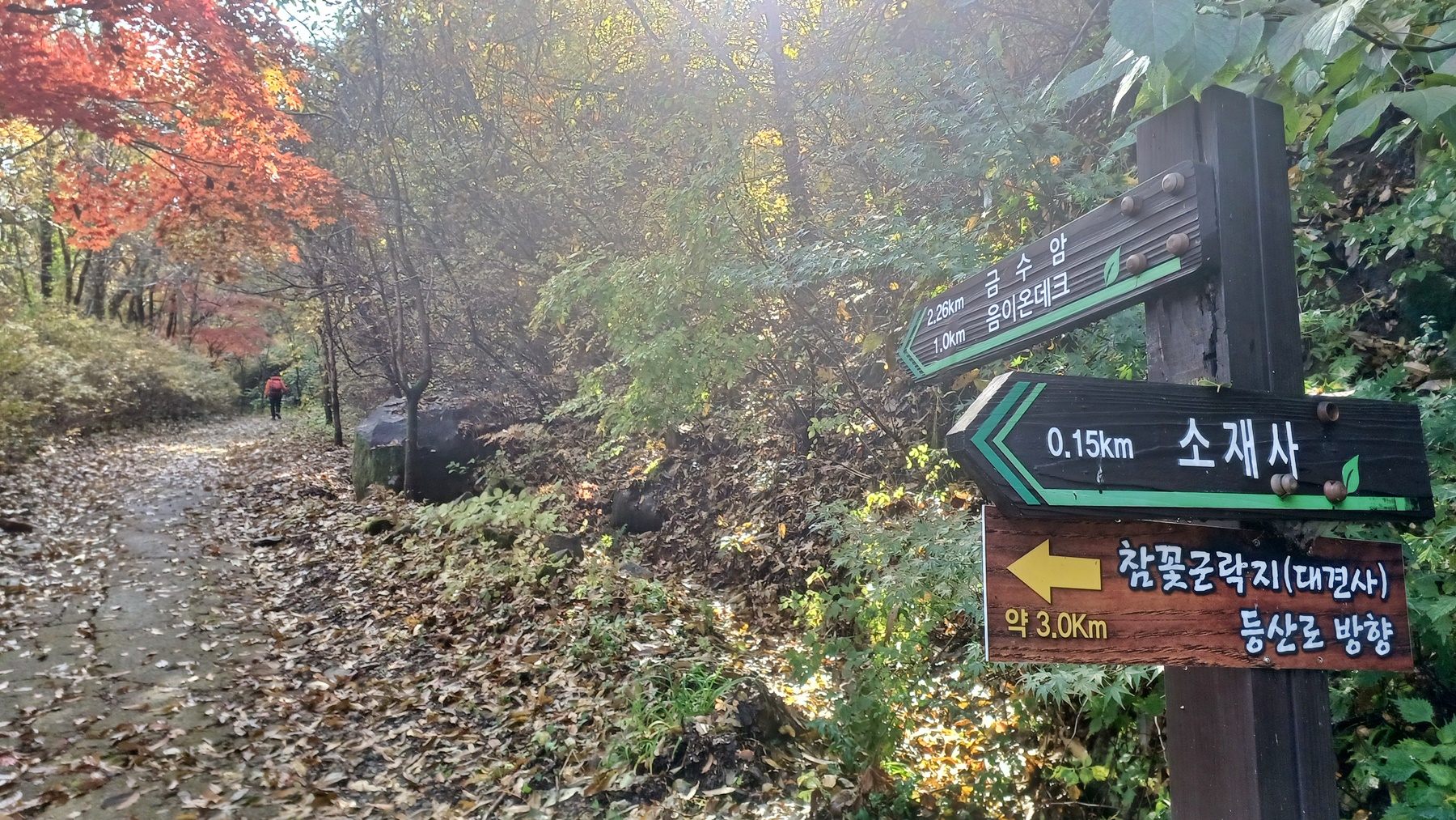 우측은 음이온 데크(1.0km)/금수암(2.26km)으로 가는 풍경 치유길(3.5km) 구간이다.