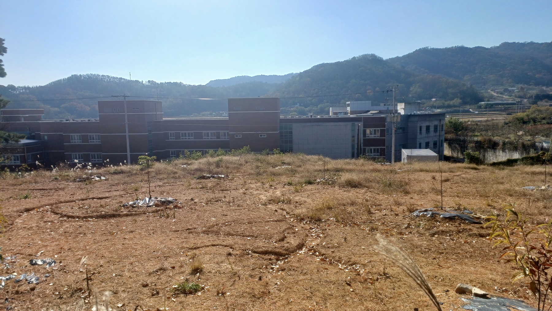 약목 고등학교 뒷편으로 무림리의 산능들이 보이고,