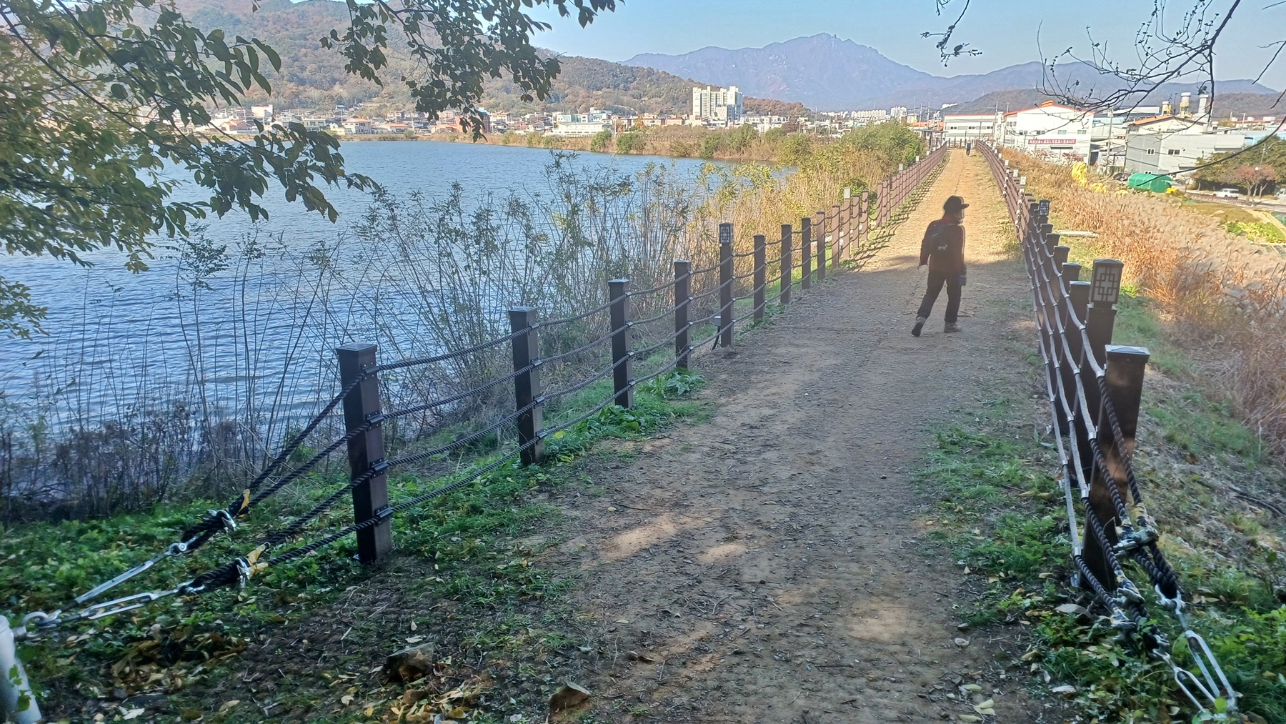 금오산이 정면으로 보이는 방향으로 둑길을 따라가면