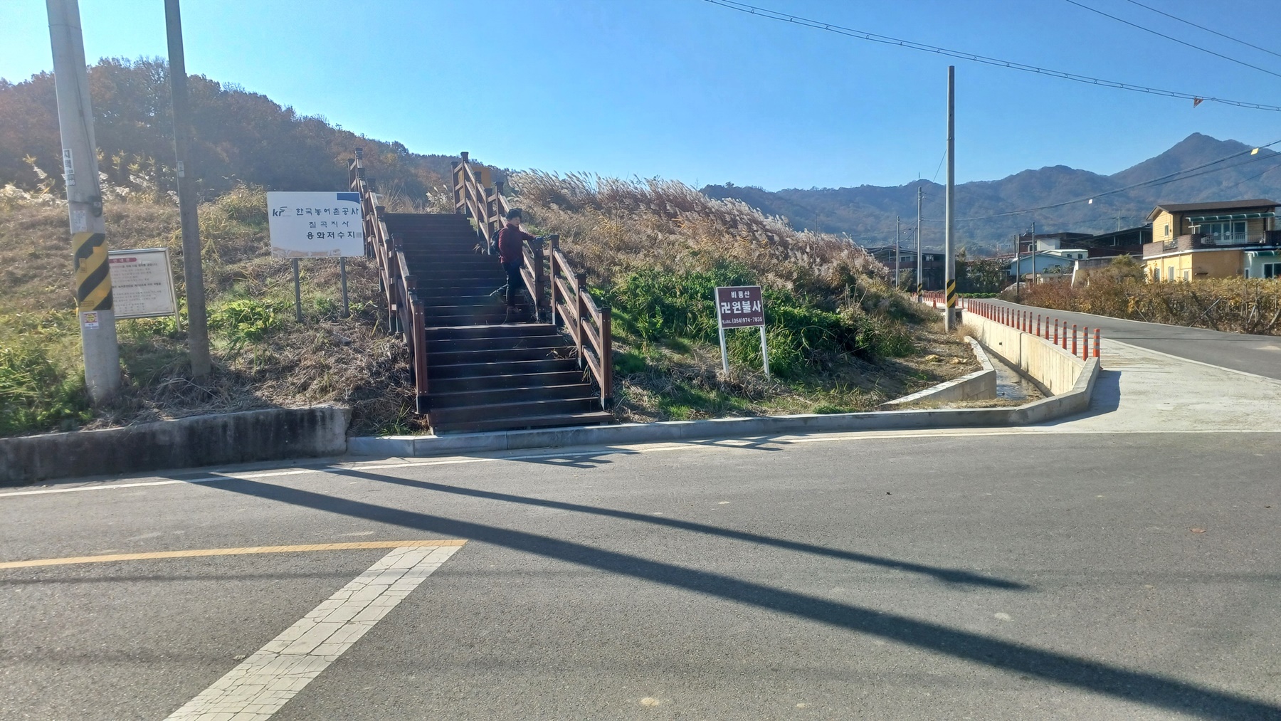 둑길 방향인 돌길을 따라 내리막길 좌측으로 휘어져 내려간다.