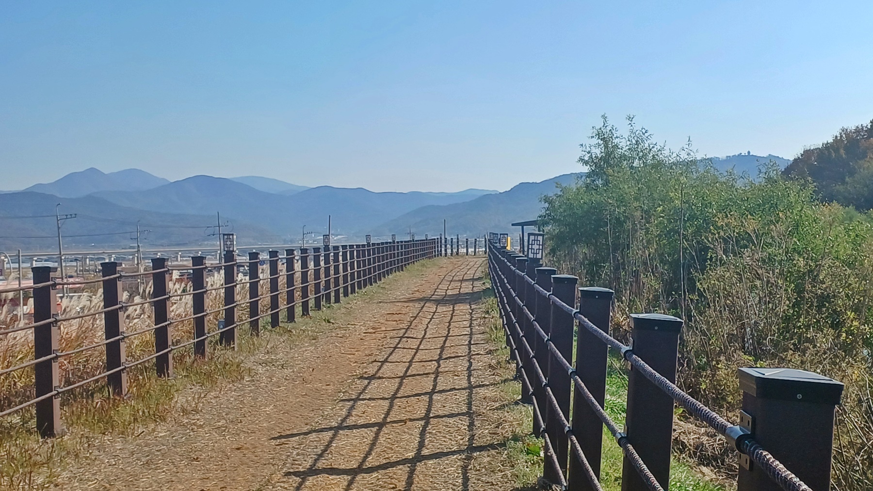좌측으로 기반산과 뒷편으로 소학산과 황학산이 조망 되는 둑길이다.