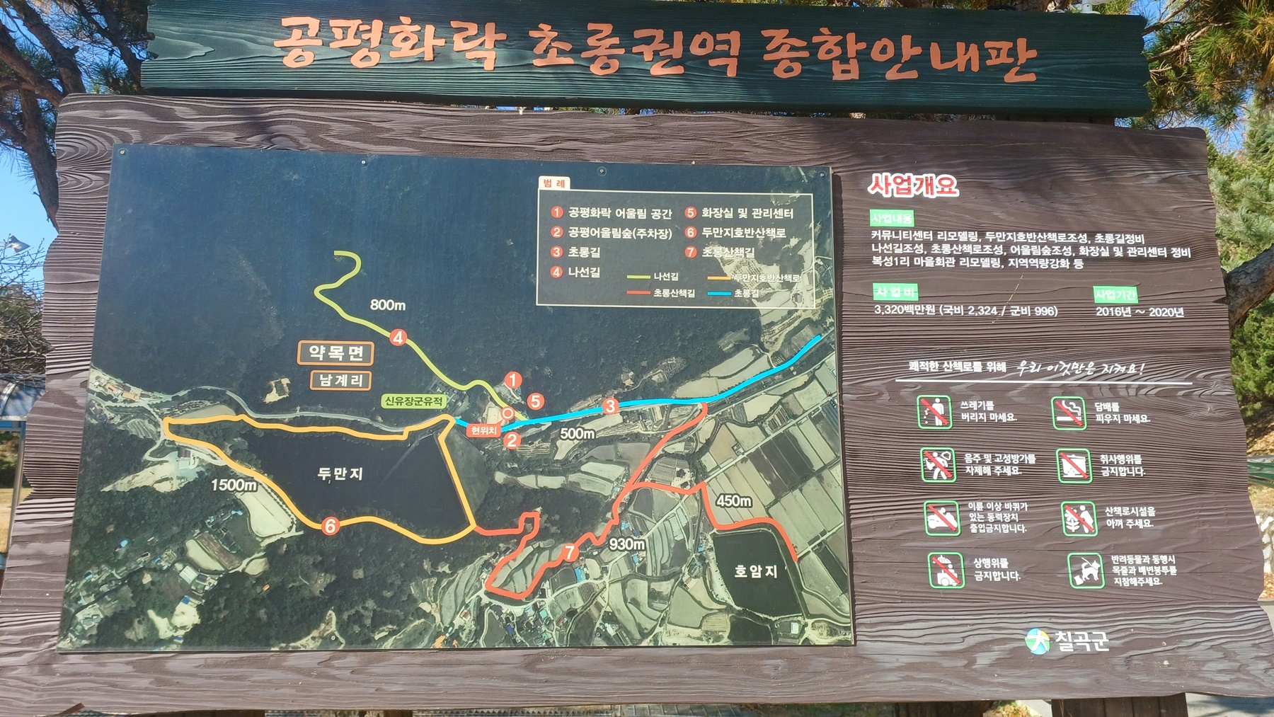 신유장군 유적지 앞 공영 주차장에 도착하여 종료하는 두만지 호반 산책로다.