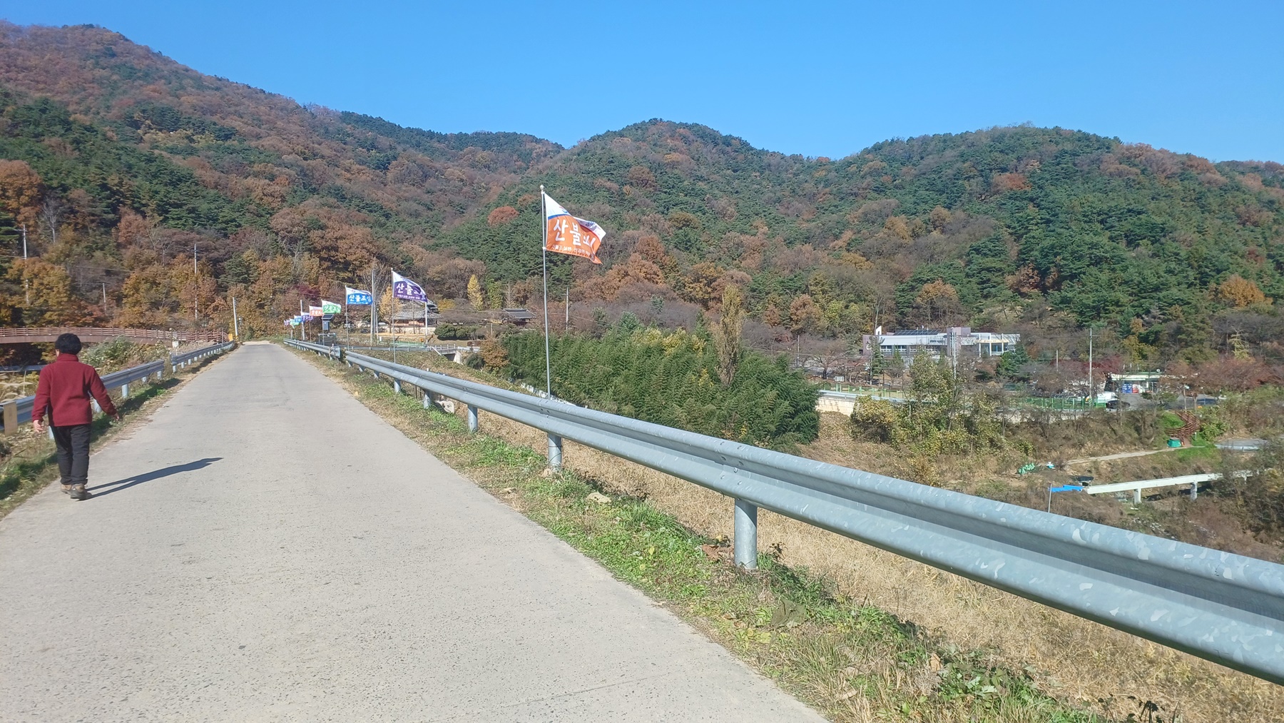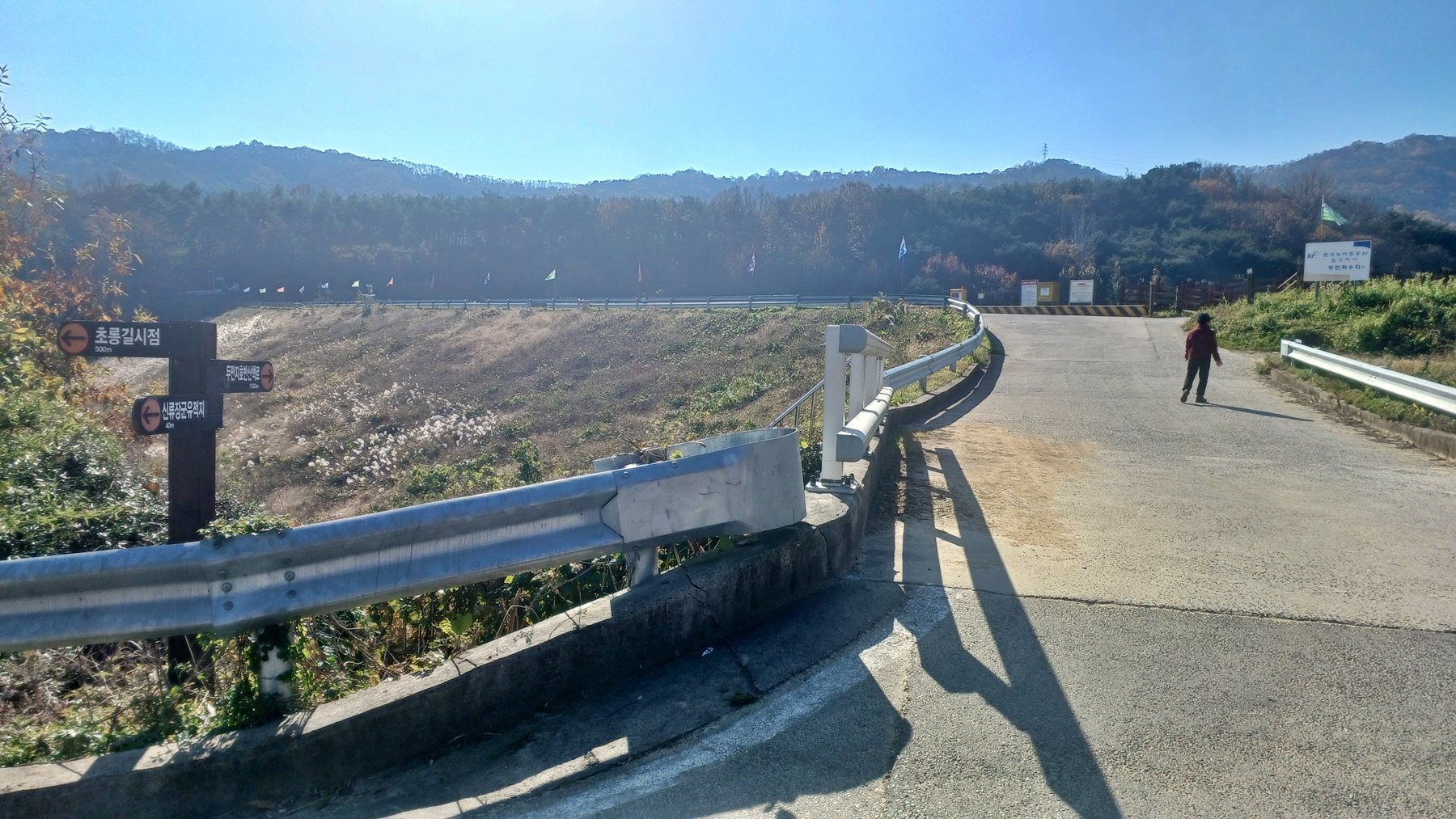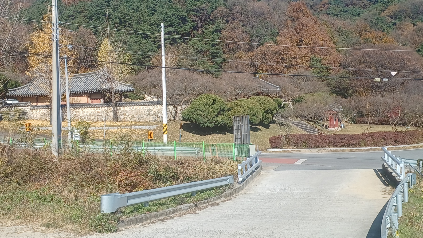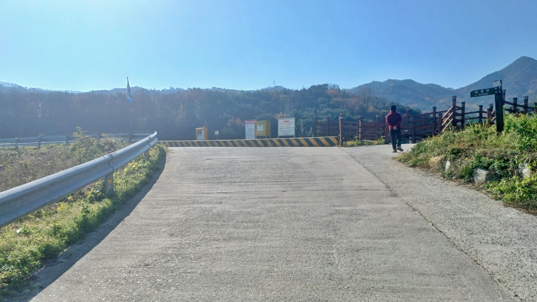 좌측 개울을 건너는 다리 입구 포장길에 도착한다.