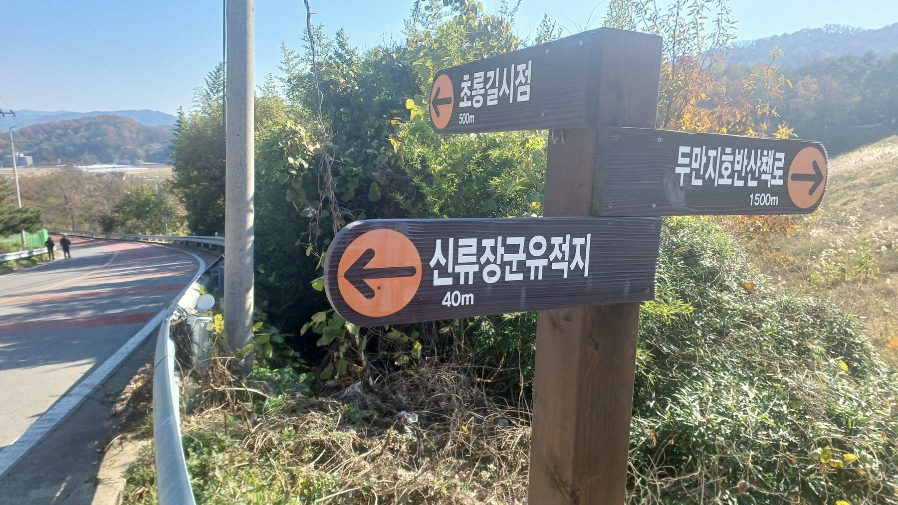 신유장군 유적지 앞 공영 주차장-도로-삼거리 갈림길(이정표)-둑길 입구(이정표;비룡산)-데크길