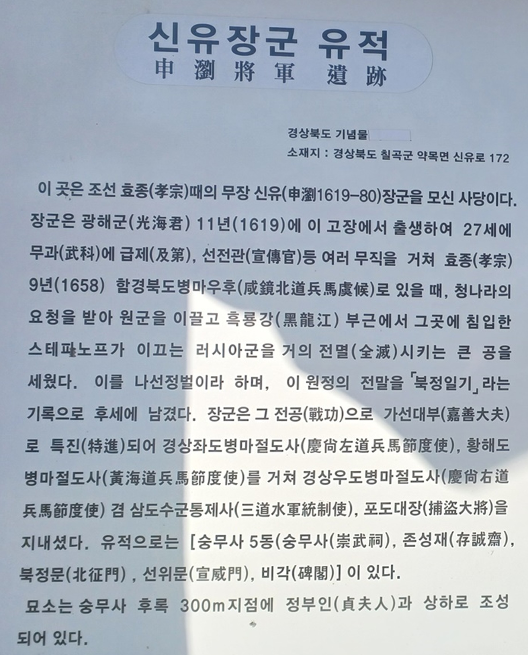 칠곡군 약목면 소재지에서 두만천을 따라 약 1.7km 신유로를 따라 오르면 신유 장군 유적지가 위치한