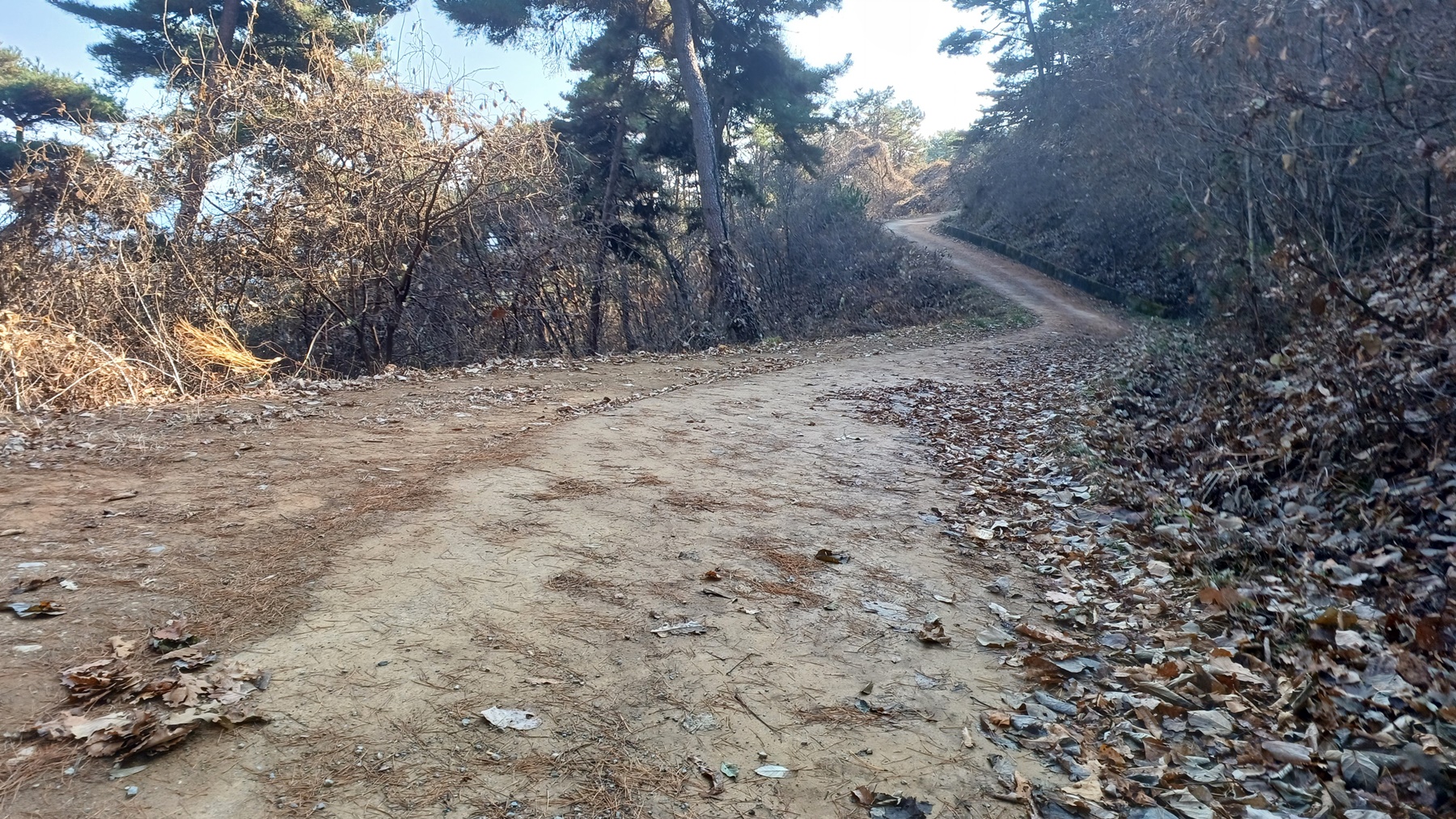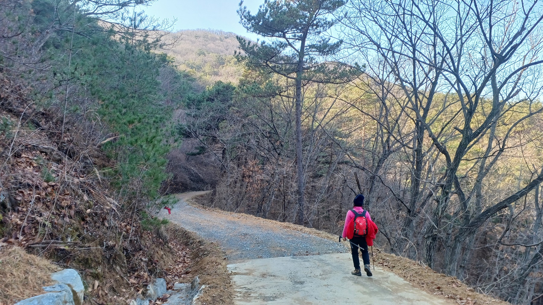 조금 전 멀리서 본 능선길이 보이는 임도를 따라 내려가면