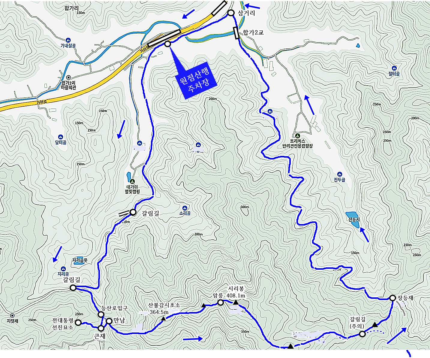 -산불 감시 초소(364.5m)-암릉-시리봉(408.1m)-갈림길-장둥재-임도-합가2교-합가 교차로 주변 주차장