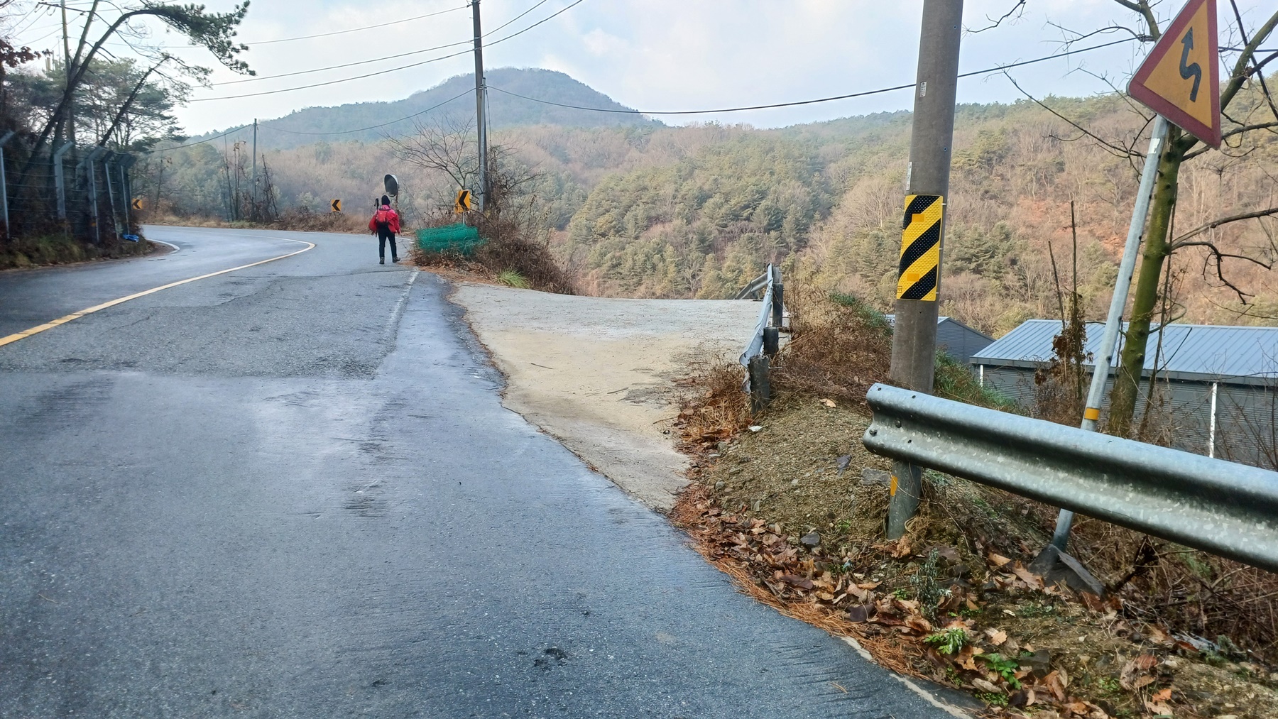 좌측으로 산불감시초소(364.5m)봉이 보이는 우측으로 휘어진 도로를 지나면