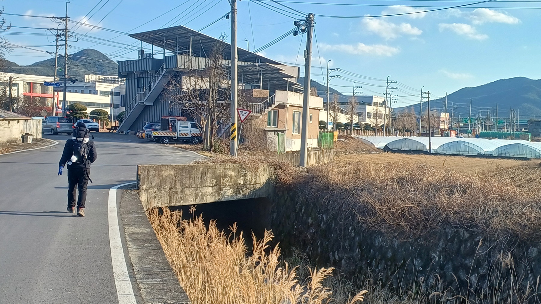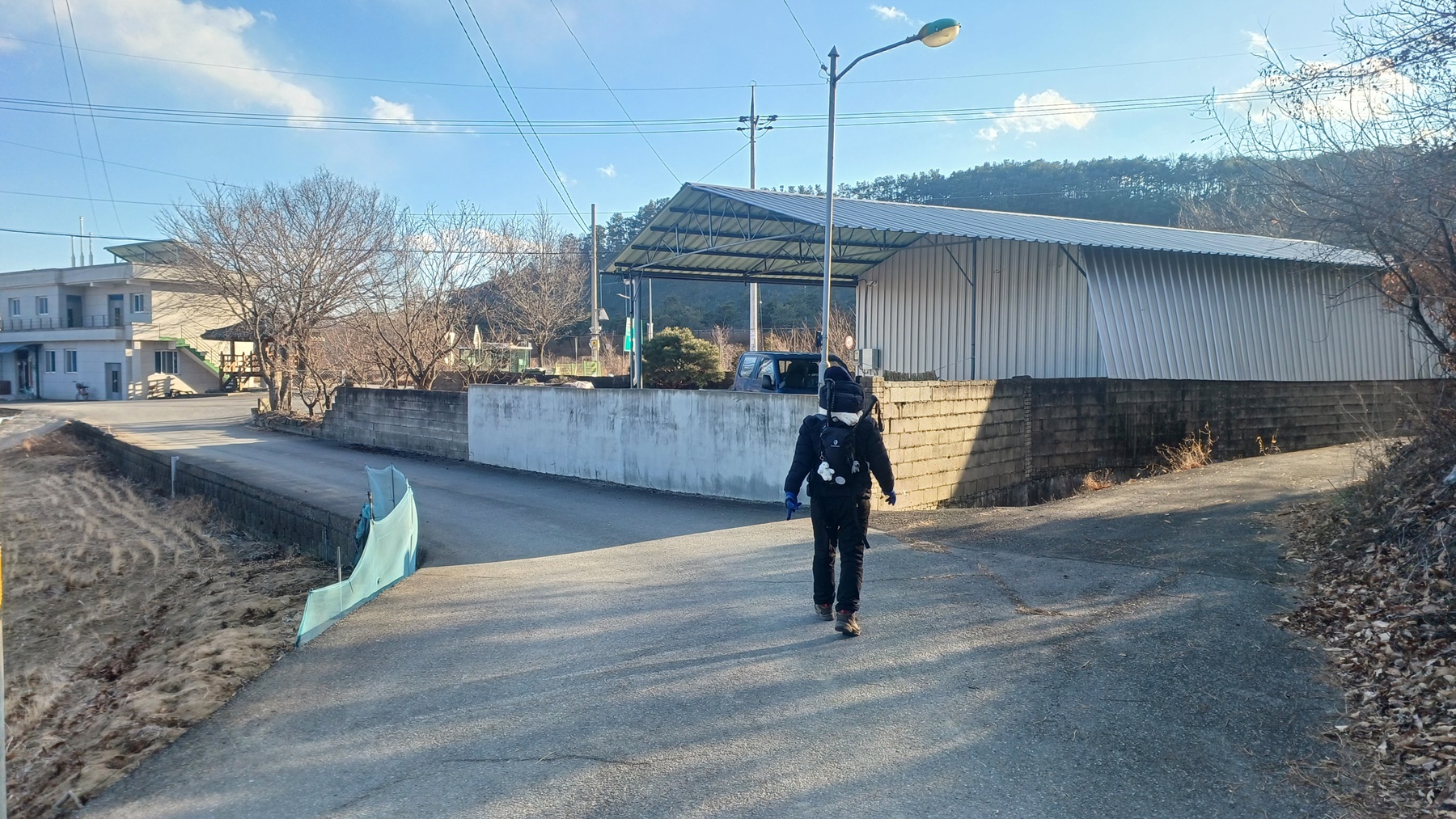 흰건물(물류창고)이 보이는 방향으로 내리막길을 내려가면