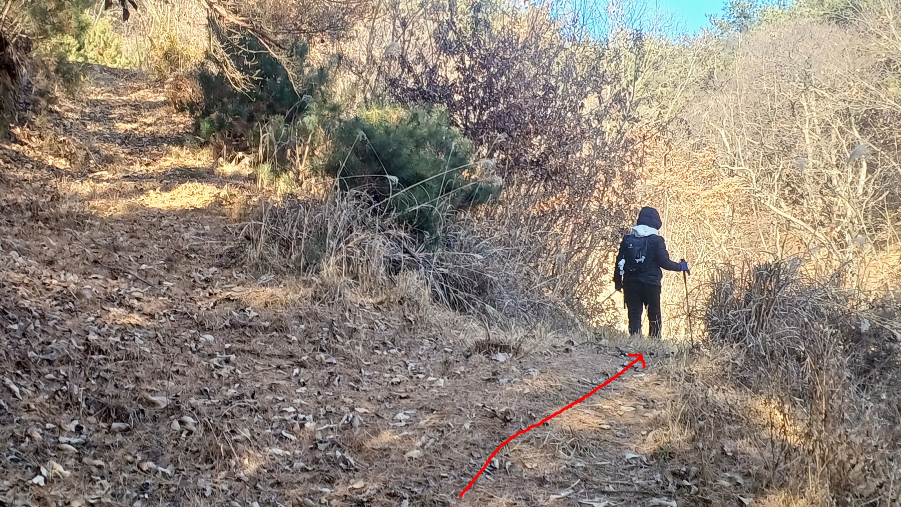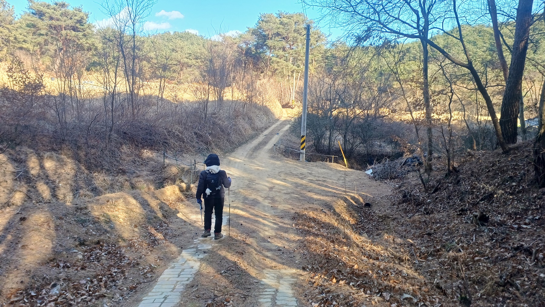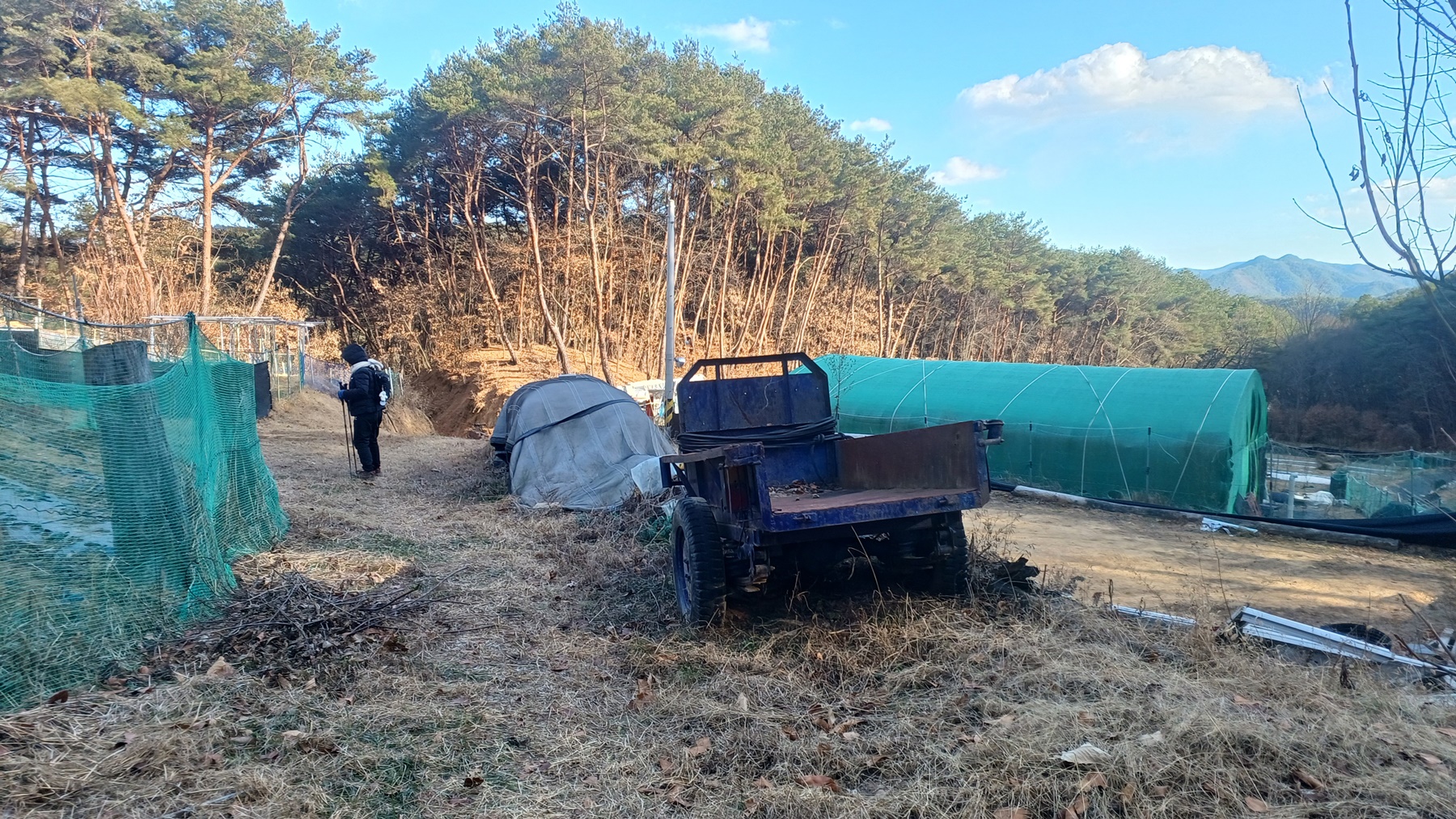 밭의 울타리와 산비탈 사이로 난 비포장길을 따라가면