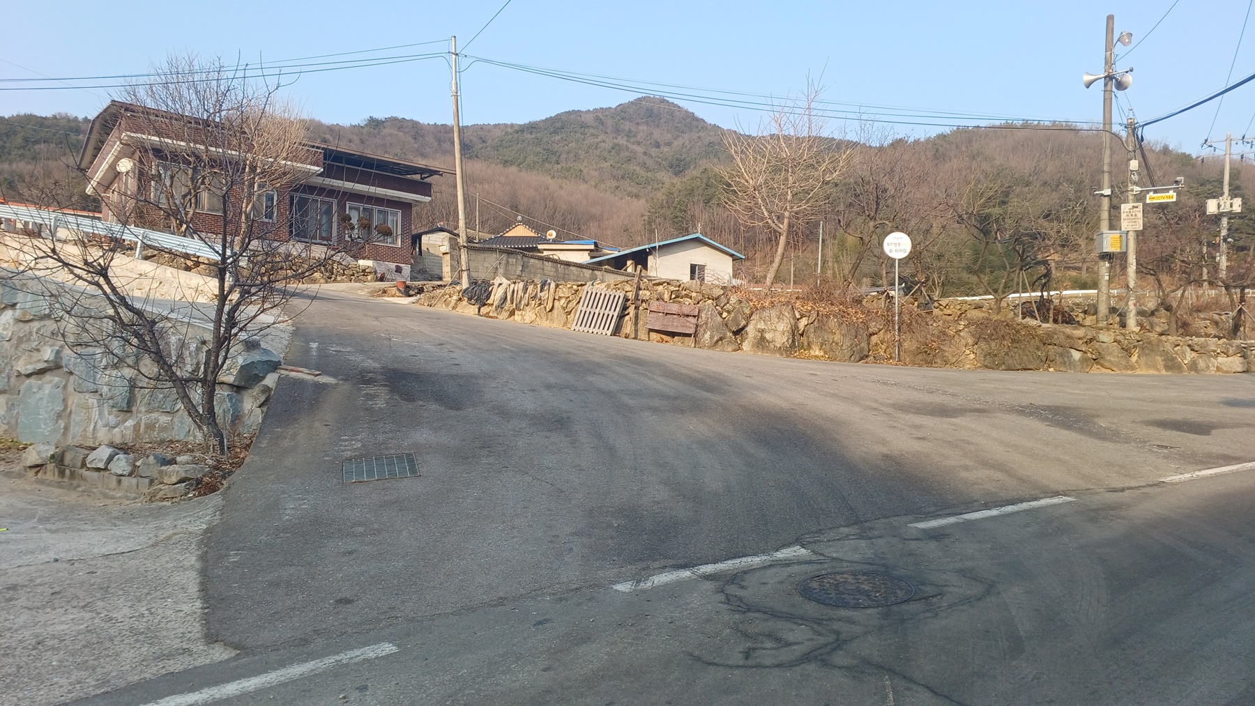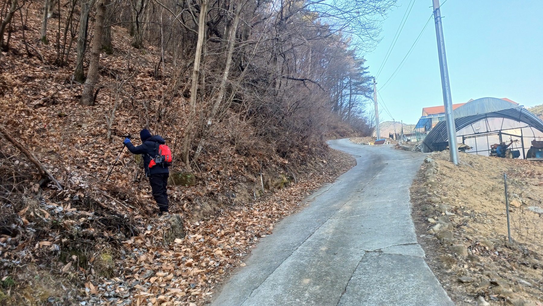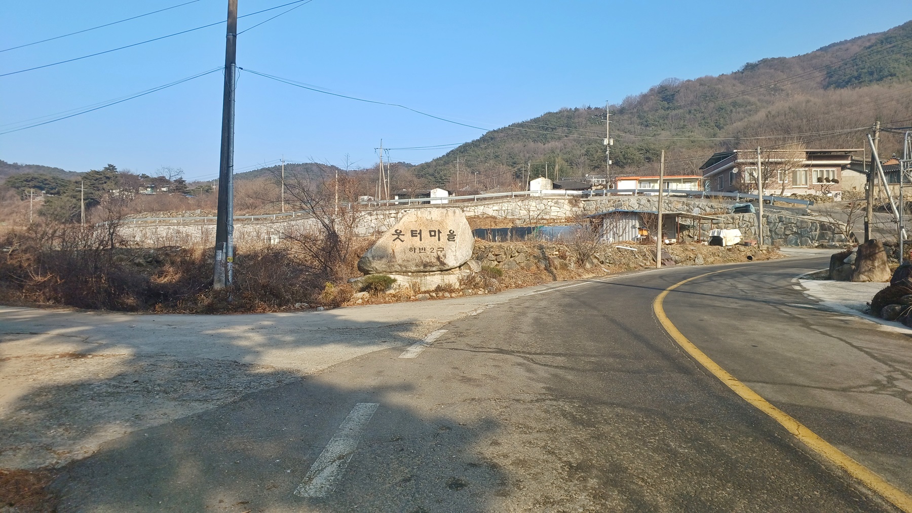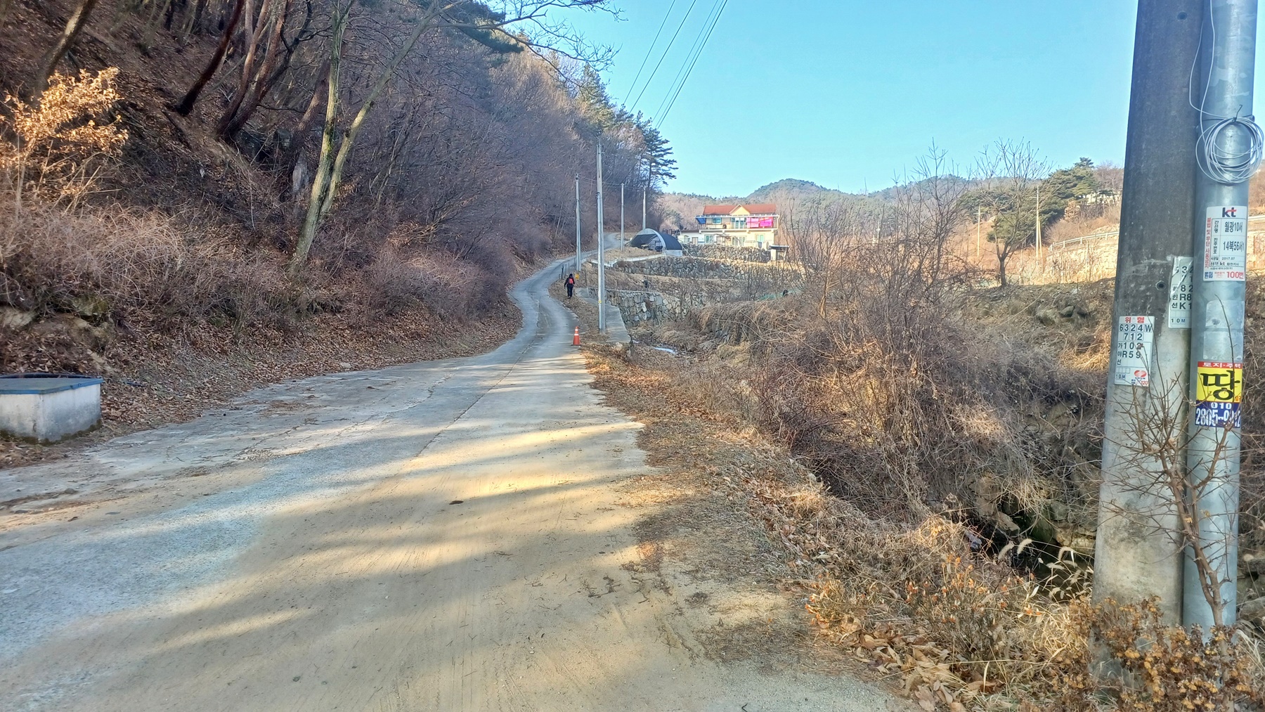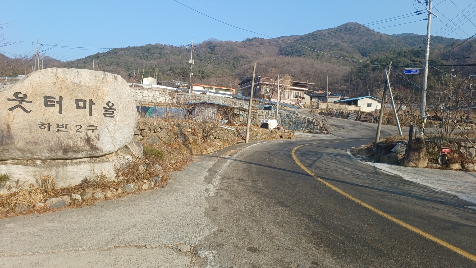 웃터 마을 표지석에서 좌측 작은 웃터골 방향으로 포장길을 따라 들어간다.