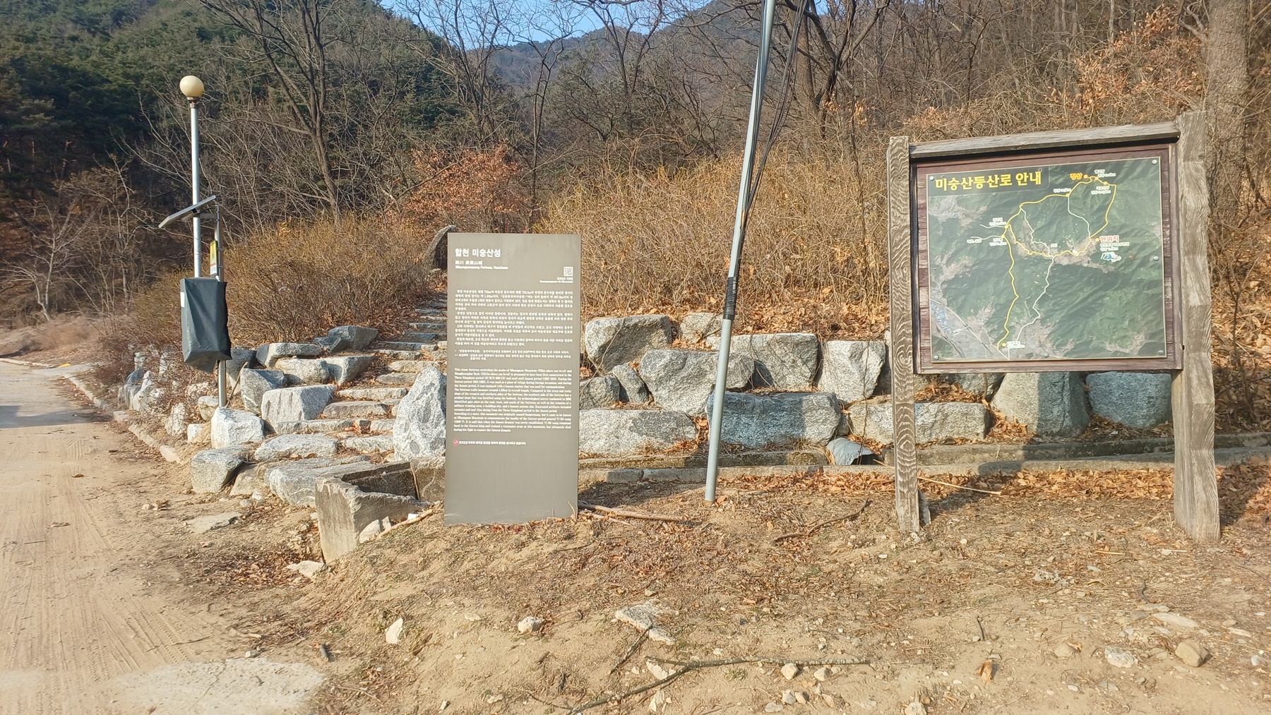 좌측 미숭산 정상석과 산불감시 초소가 보이는 방향으로 산성길을 오르면