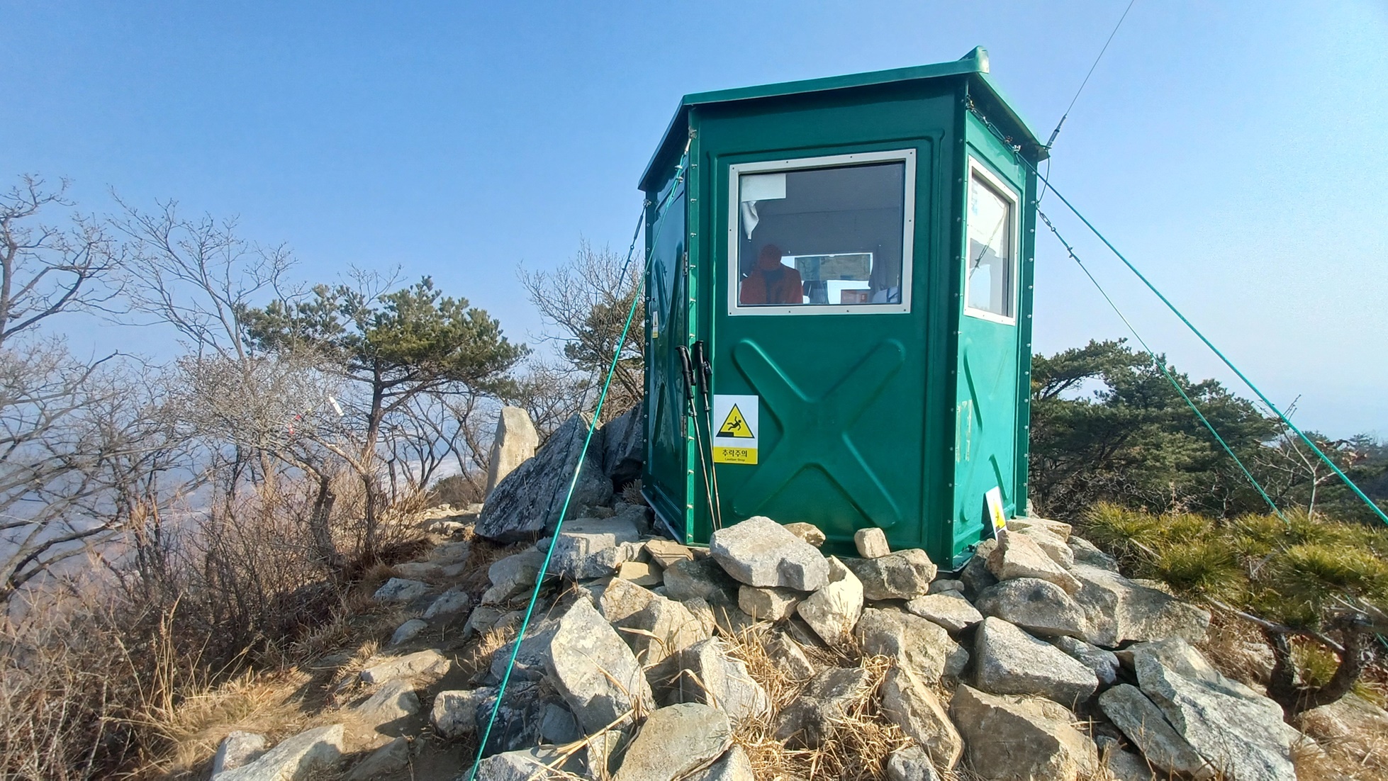 정상석 뒷편에는 산불 감시 초소가 보인다.