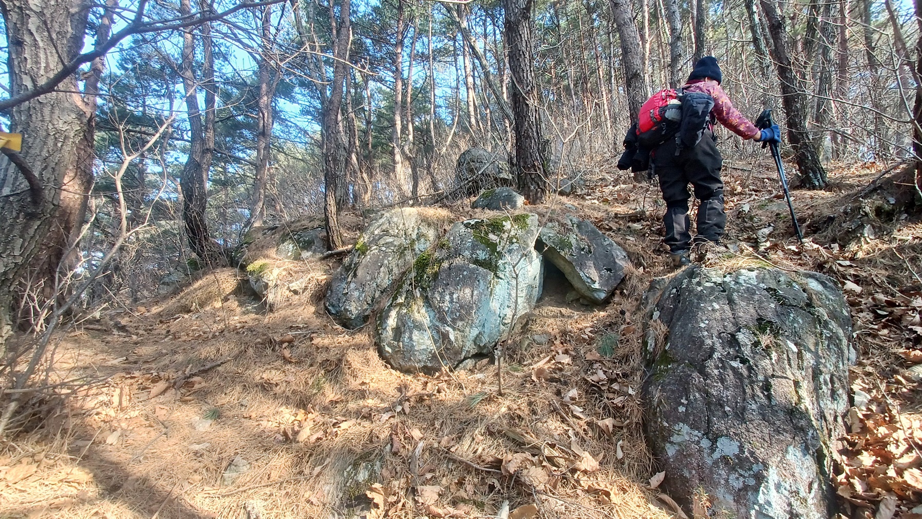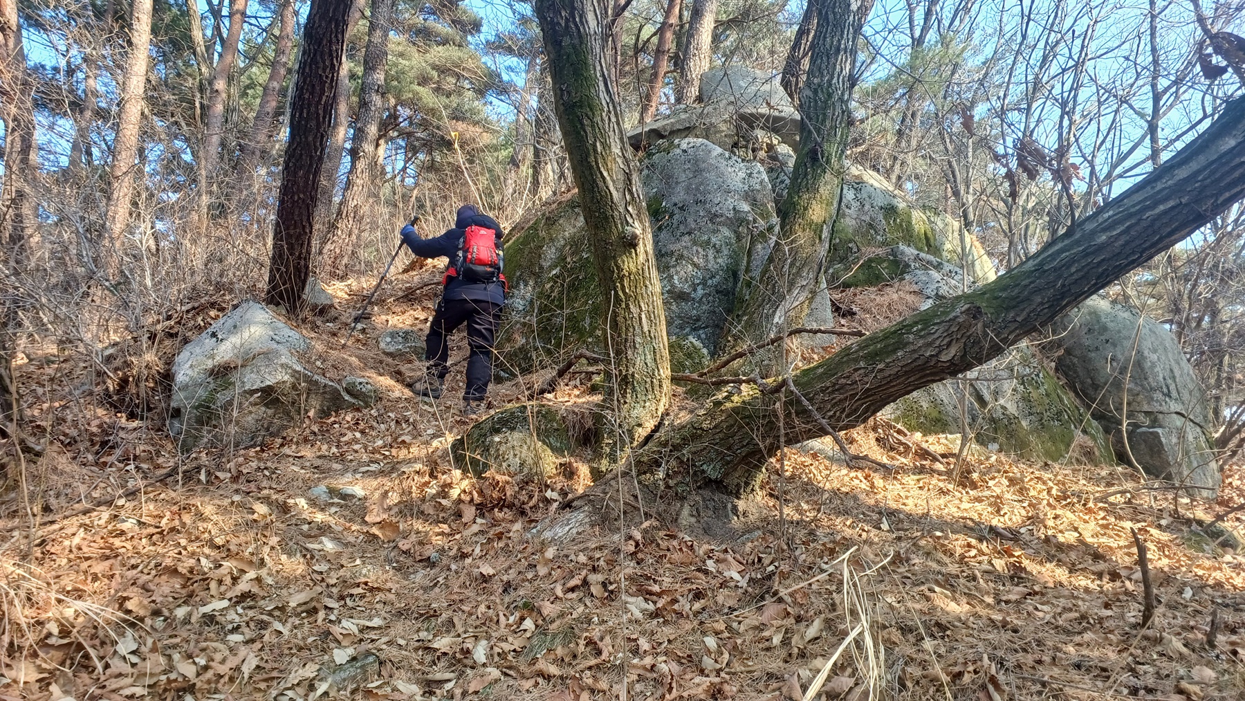바위 사이를 건너 내리막 산사면길을 가다보면