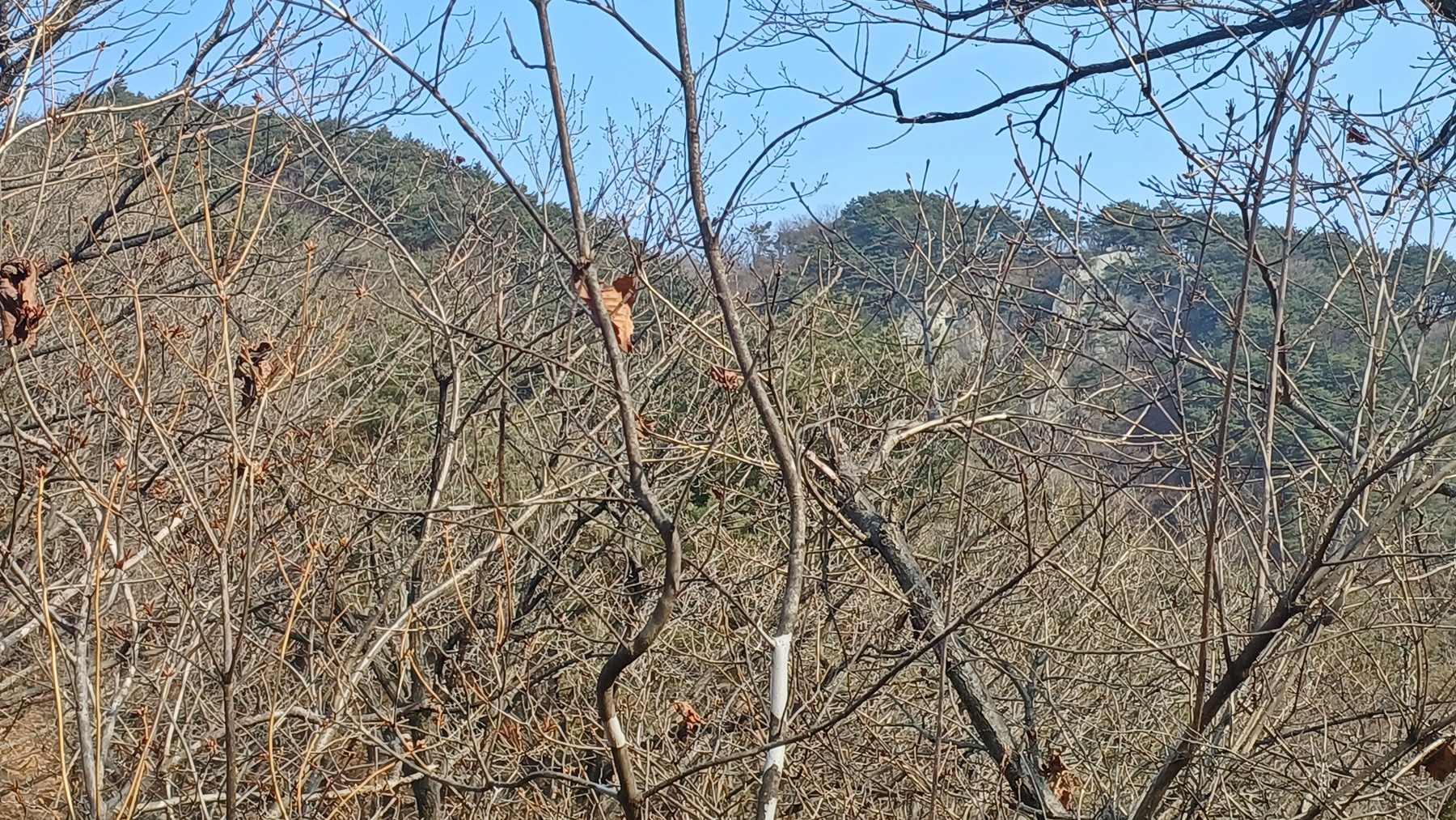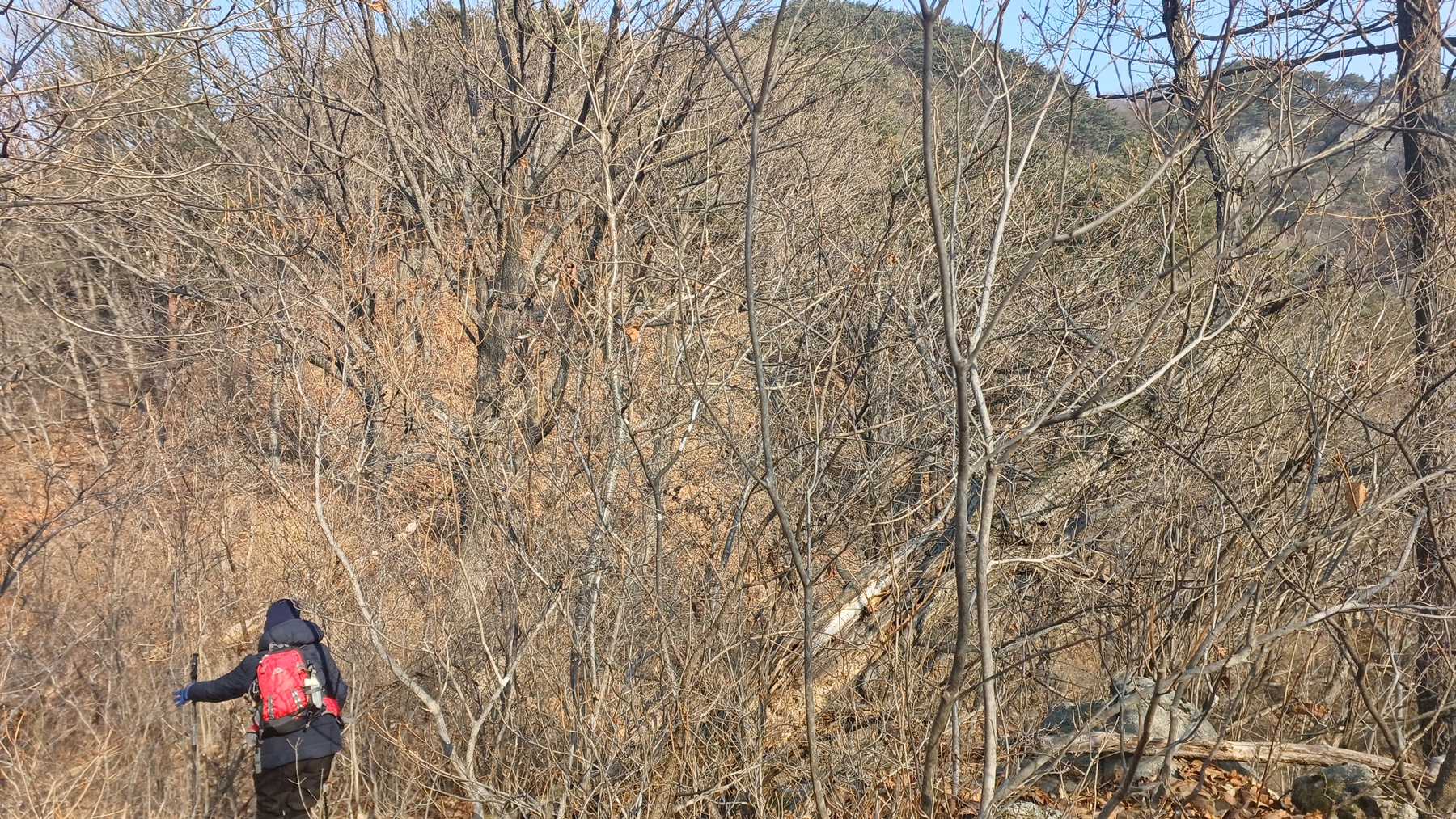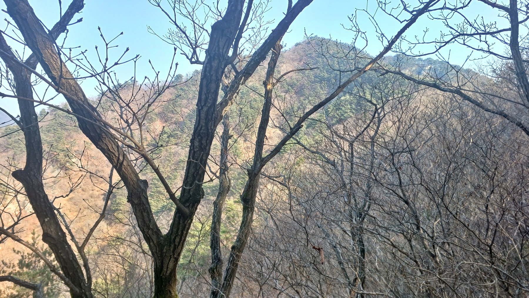 관창봉에서 올라왔던 능선으로 되돌아 가는 능선 우측으로 저멀리 나무 가지 사이로