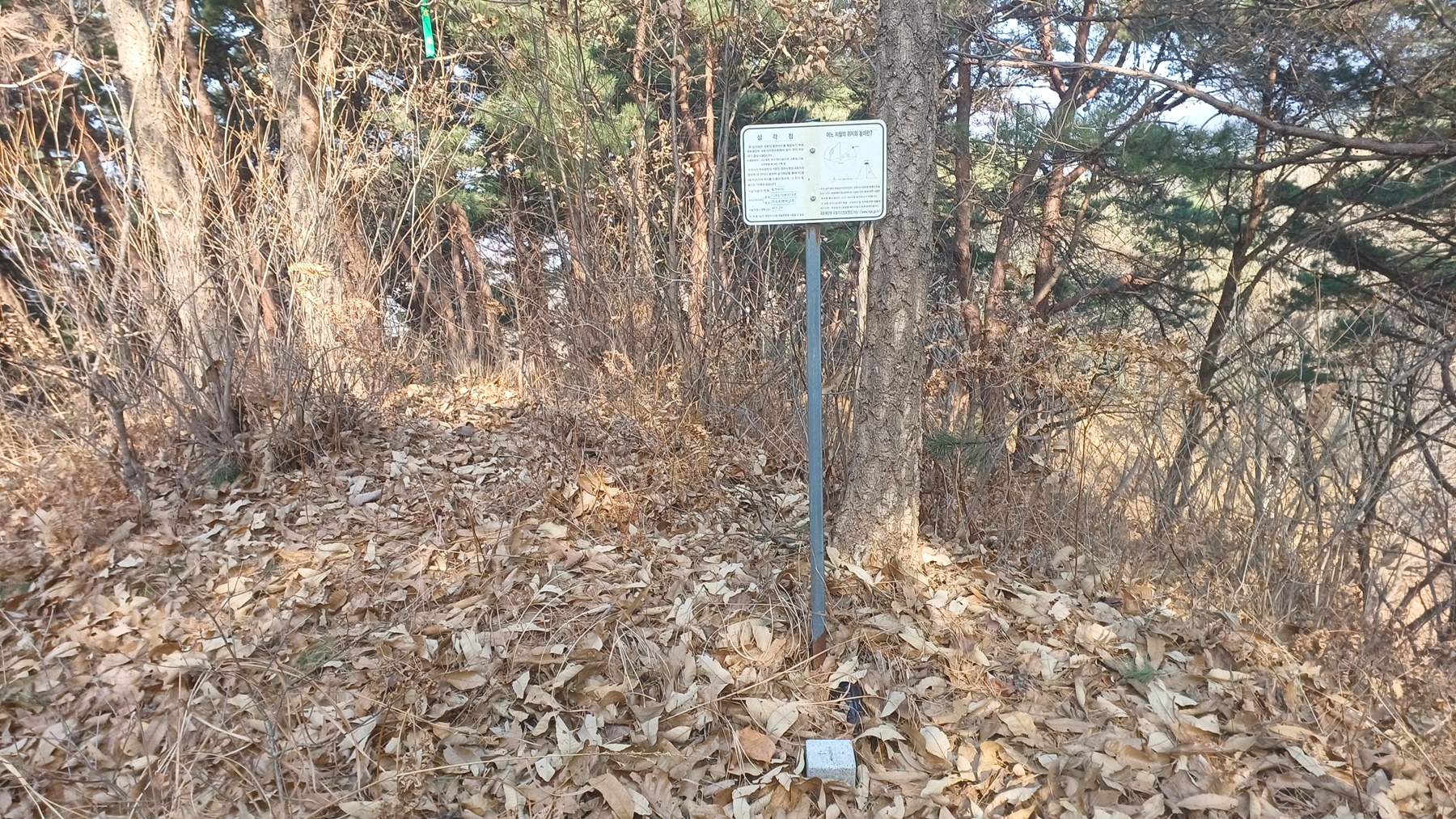 관창봉이 보이는 좌측 낙엽이 쌓인 비탈진 산사면길로 올라