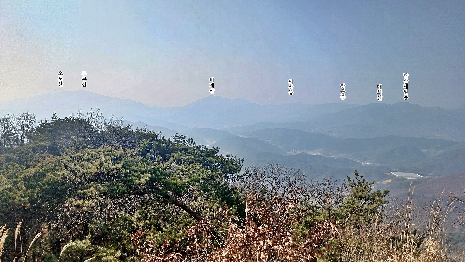매화산 뒷쪽으로 남산제일봉이 조망되고
