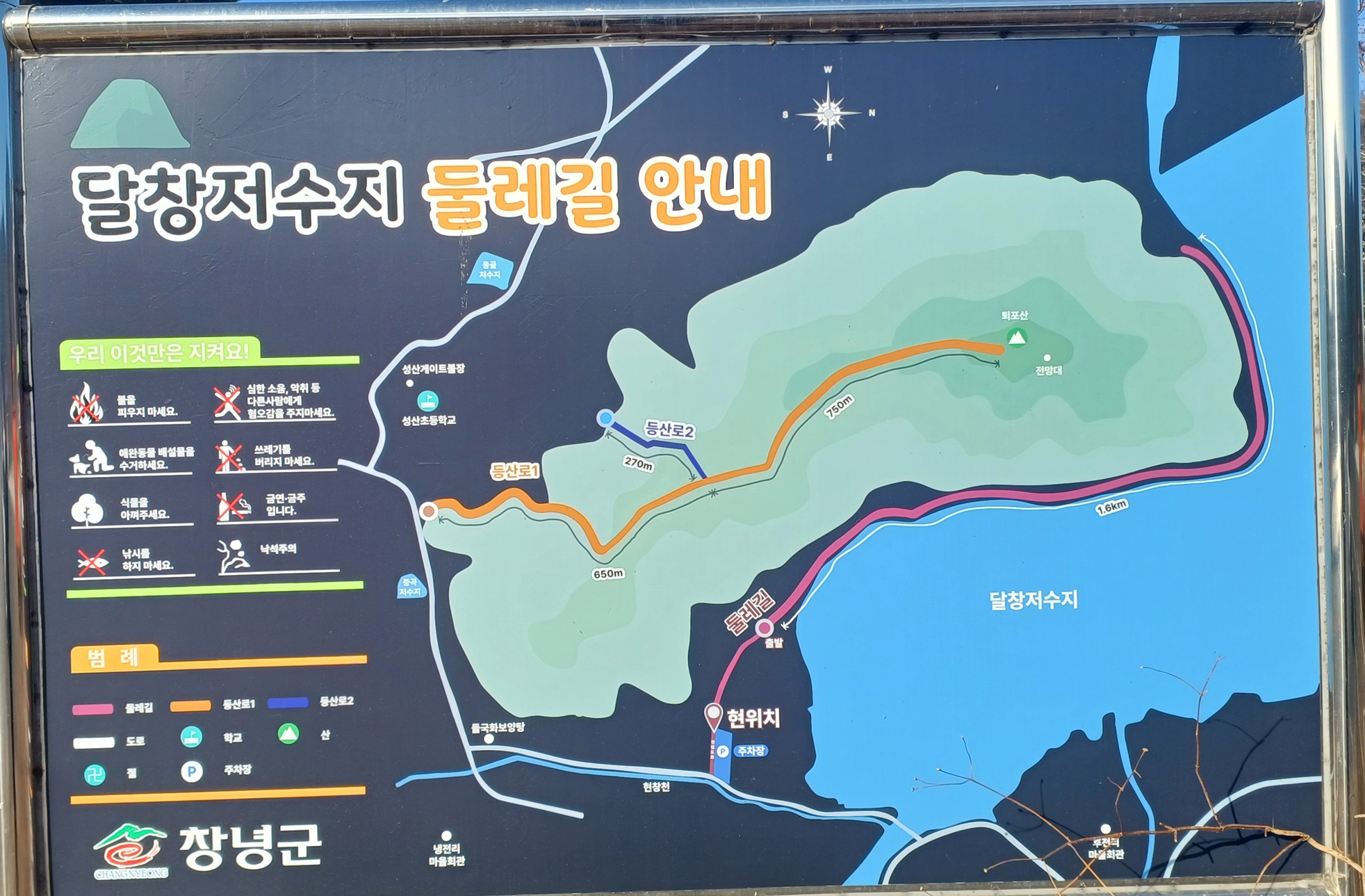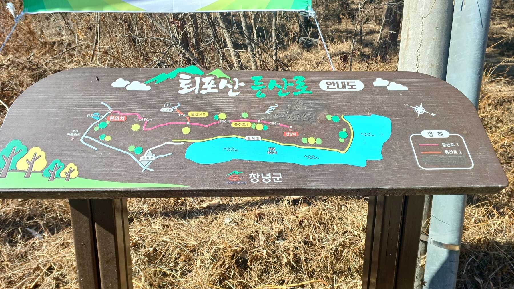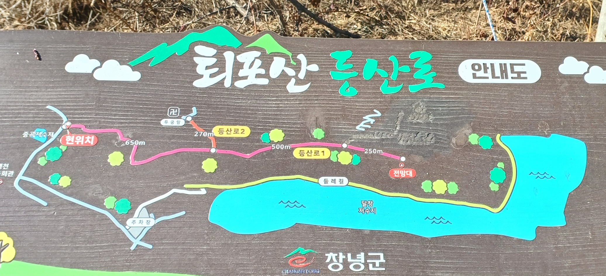 달창 저수지 둘레길과 퇴포산 등산로를 알려주는 안내도가 위치하고 있다.
