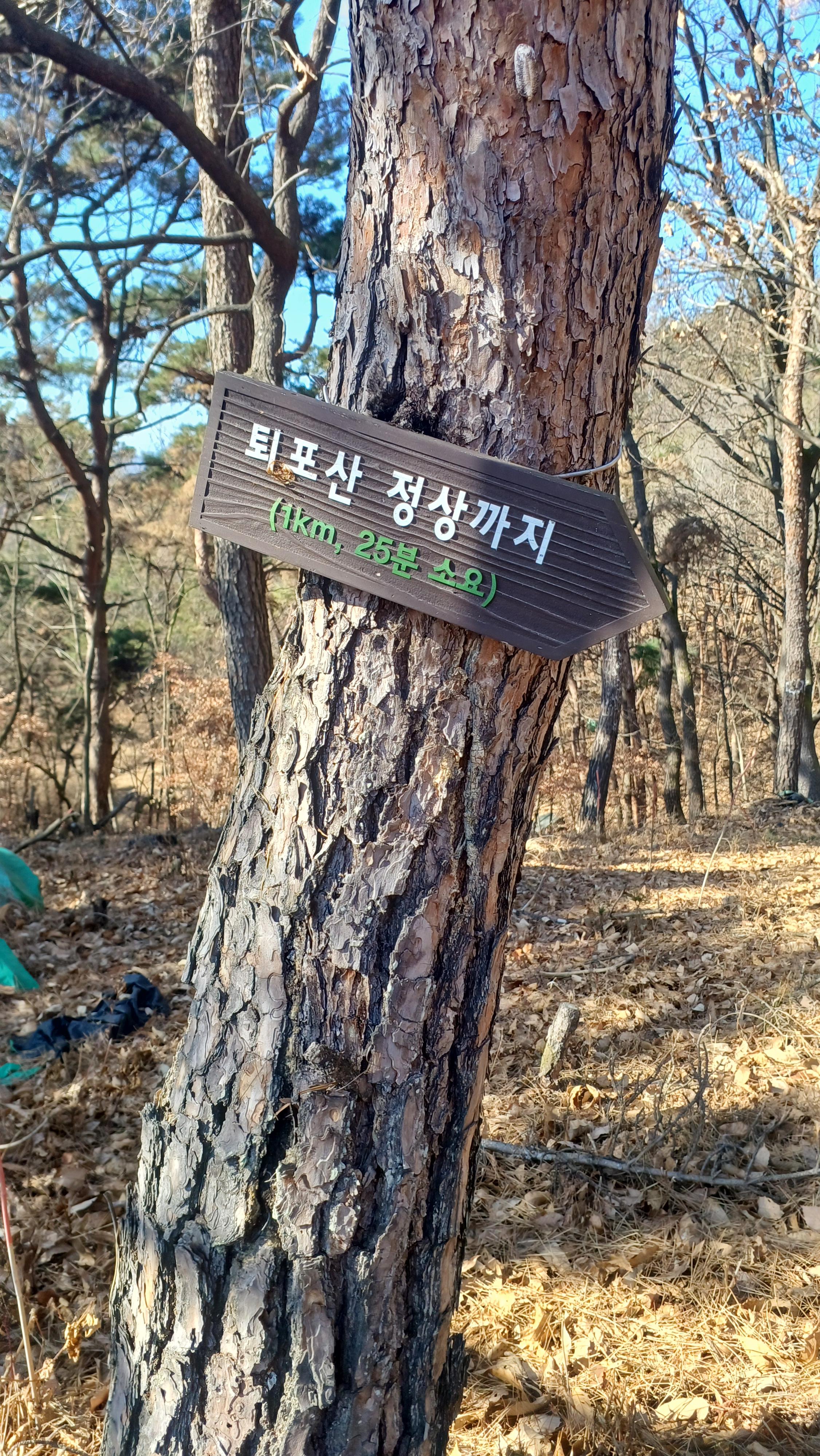 나무에 달린 안내판(퇴포산 정상까지 615m,15분 소요)이 있는 무명봉을 지나면