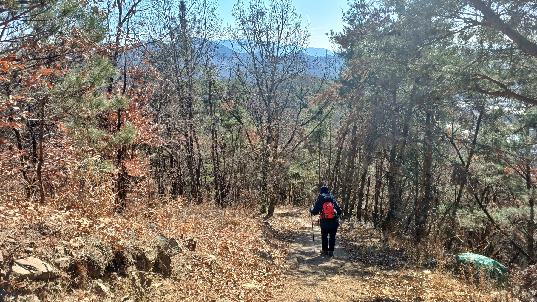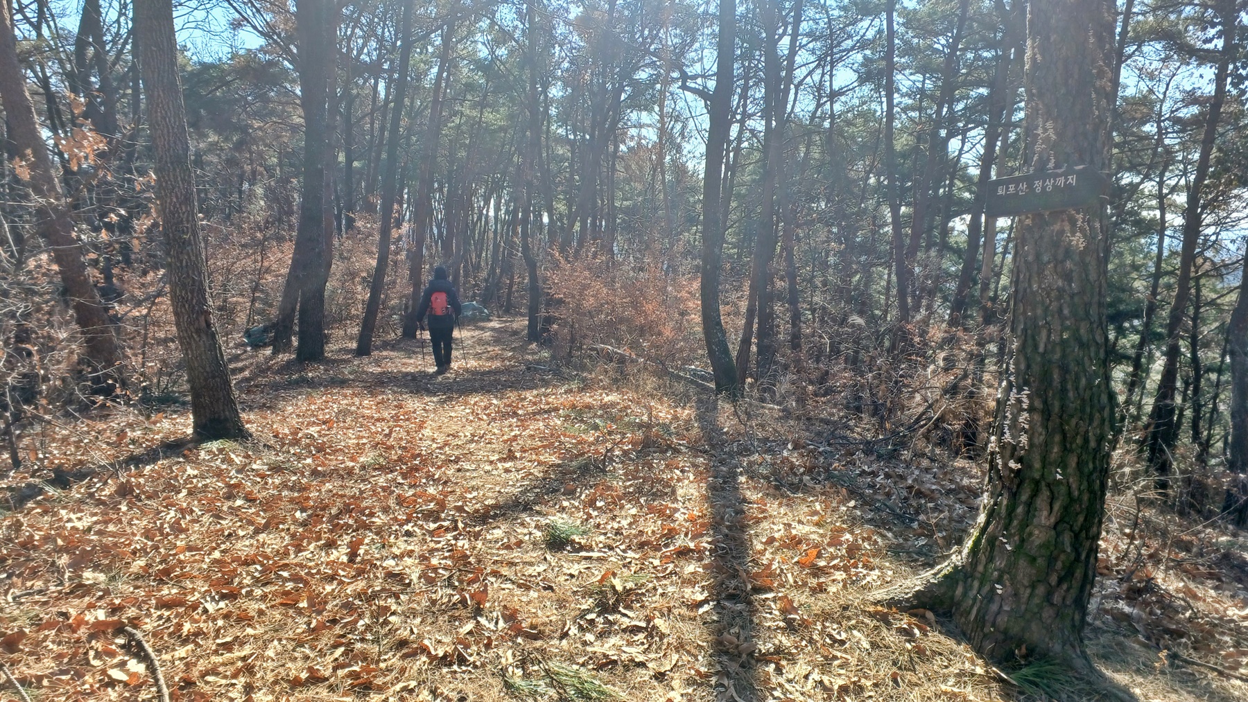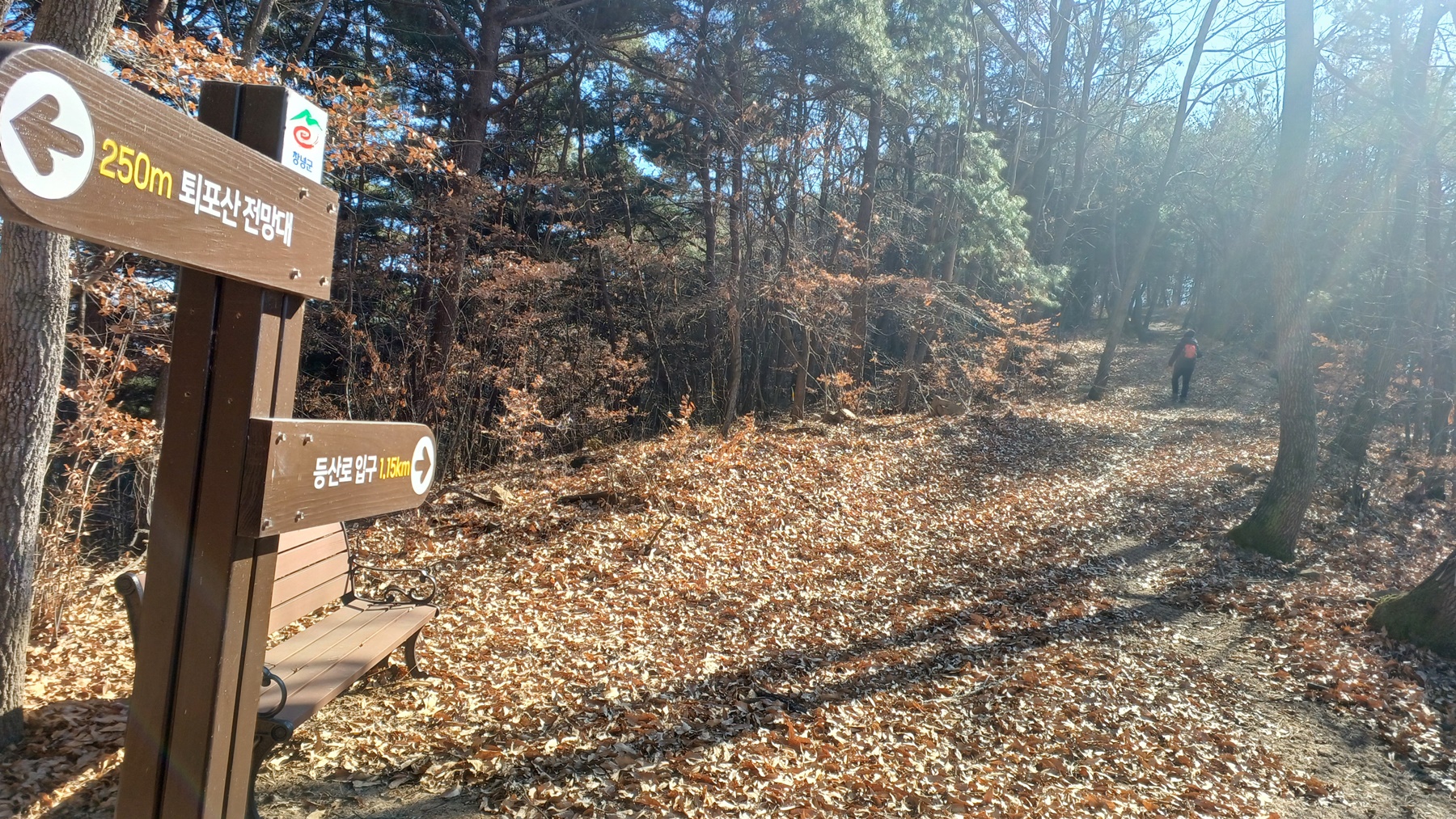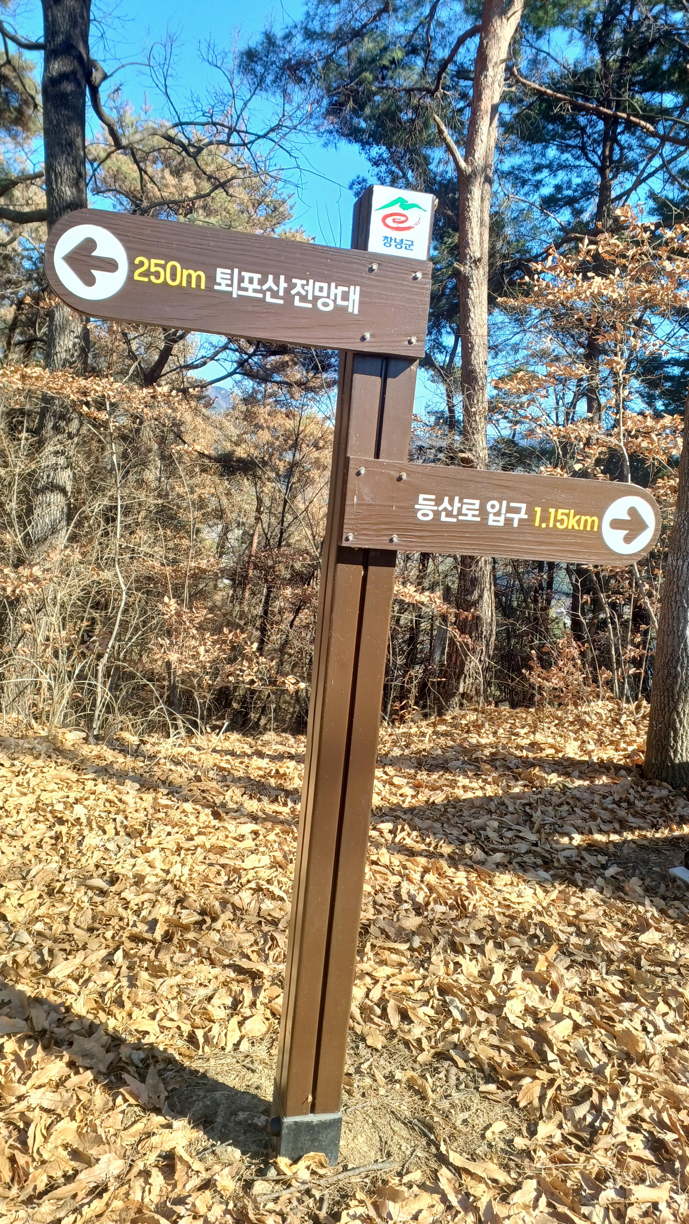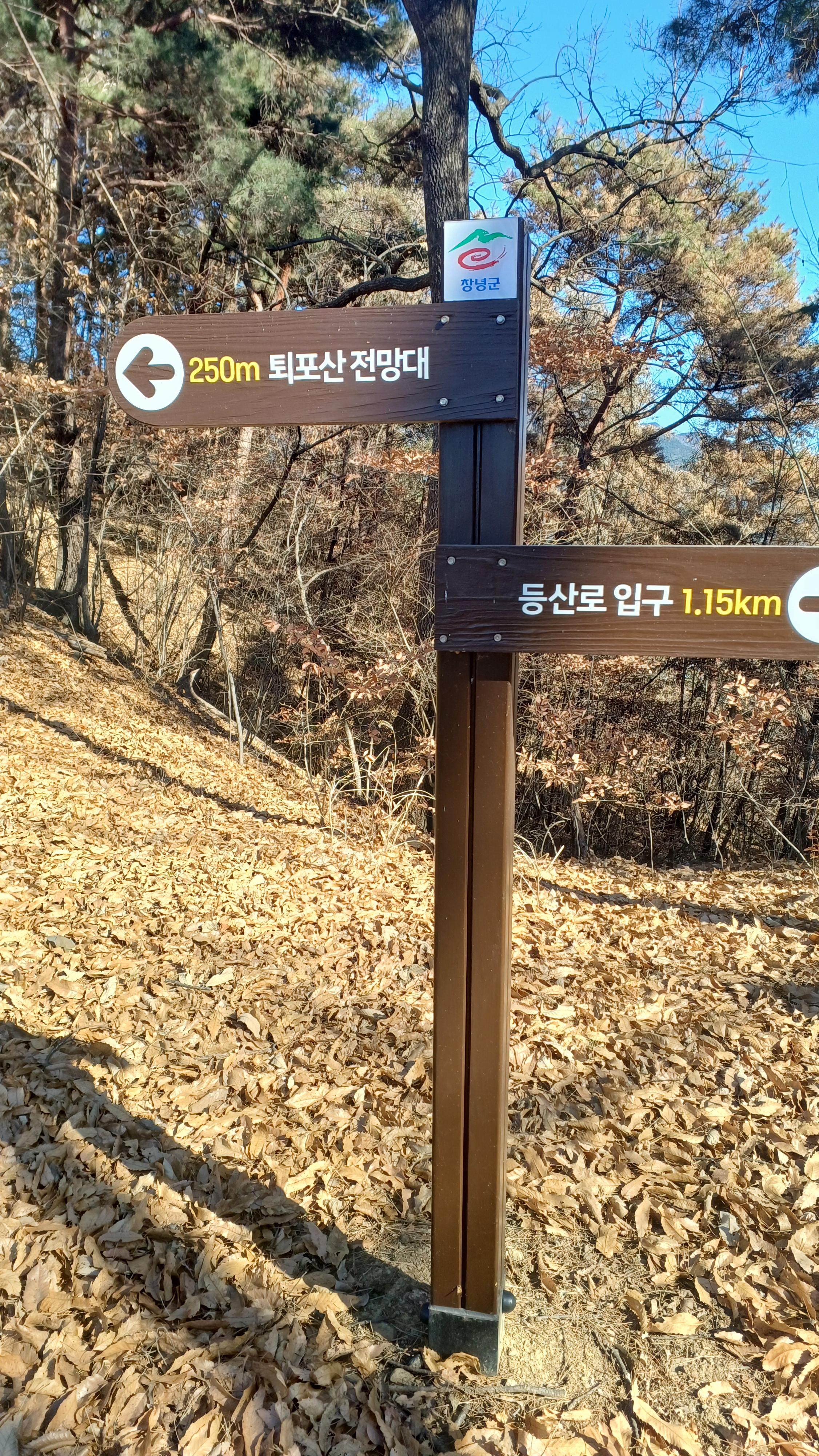 우측은 퇴포산 정산과 전망대를 오른 후 다시 이 곳으로 되돌아와 우측 등산로 입구(1.15km) 방향으로 하산하는 능선이다.