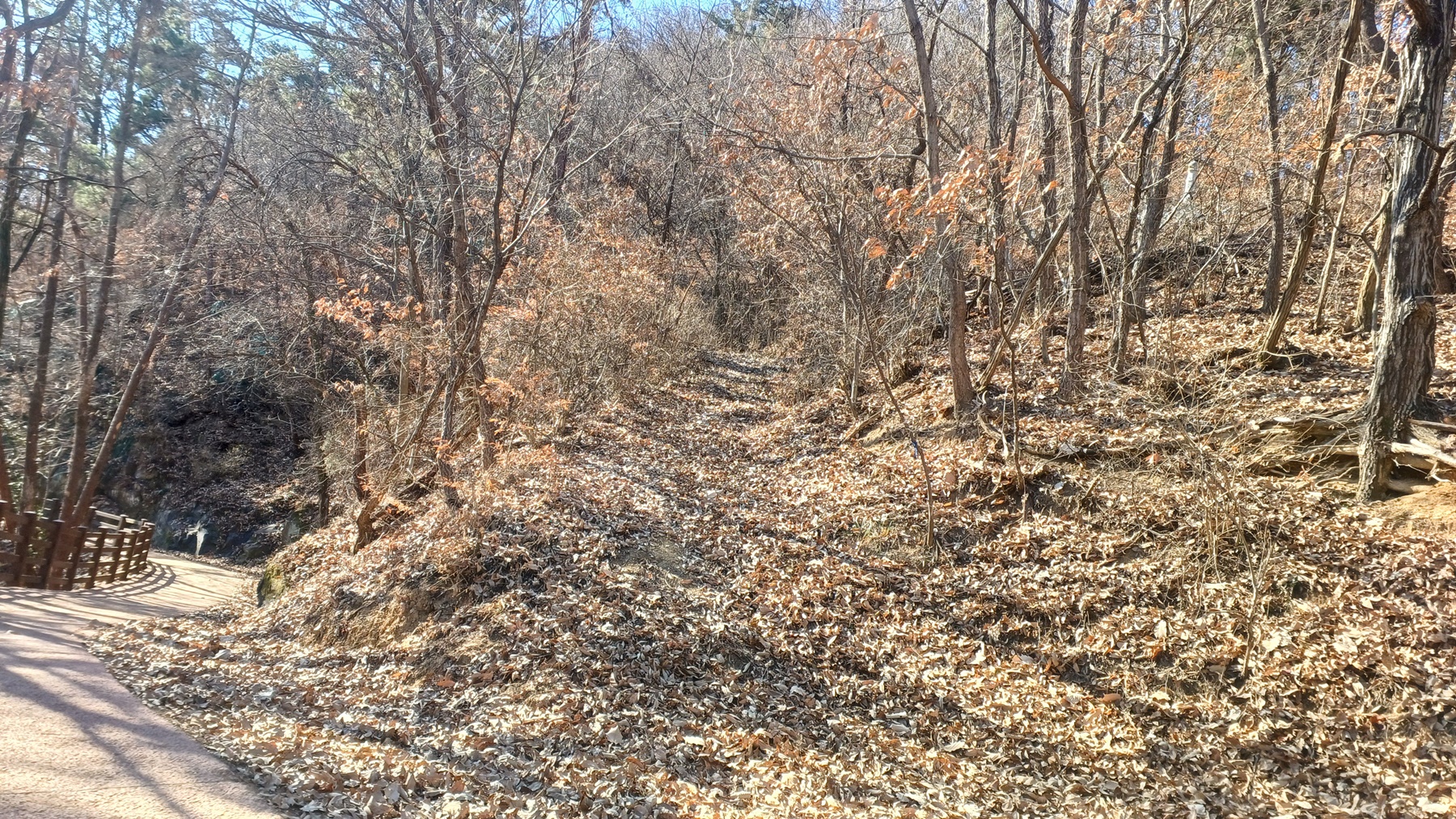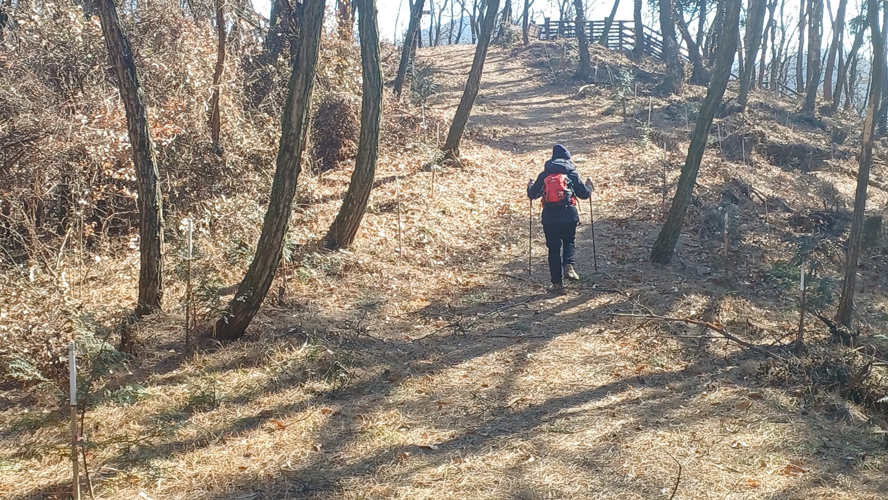 완만한 오르막 목책 구간이 시작하는 산사면길을 따라가면