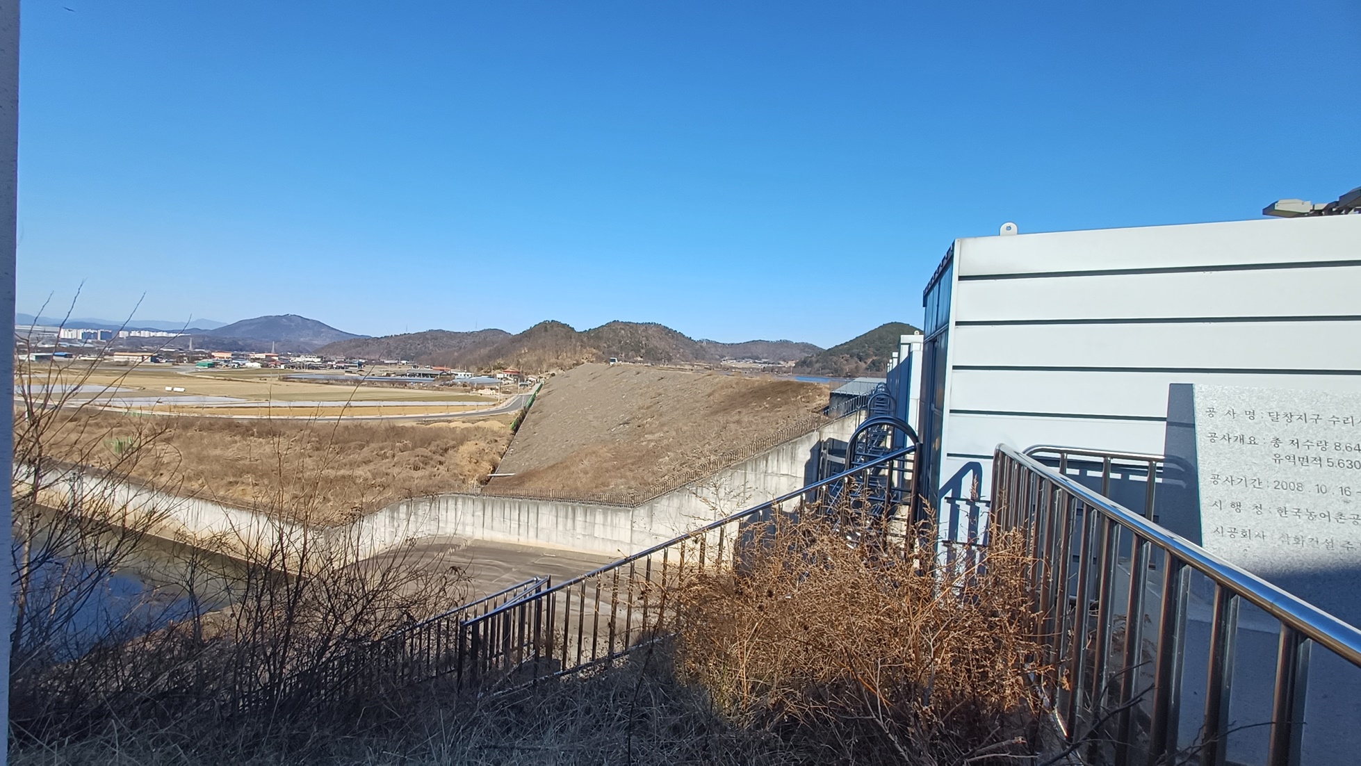수문과 수위 조절탑 사이로 달창 저수지가 보이고
